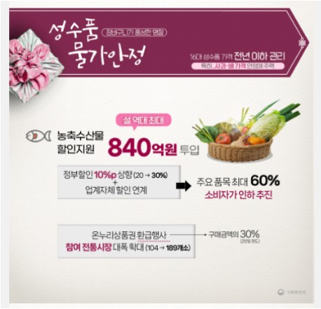 올해 설 차례상에 빠질 수 없는 과일인 사과와 배의 가격이 작년에 비해 상승하였습니다. 이에 정부는 평년보다 많은 양의 사과와 배를 공급하여, 가격 상승률을 한 자리로 관리하기로 하였습니다. 또한, 정부 지원과 유통 업체의 할인 행사를 통해 최대 60%의 할인 혜택을 제공할 예정입니다. 더불어, 온누리 상품권 가맹점도 더욱 확대될 예정입니다.
